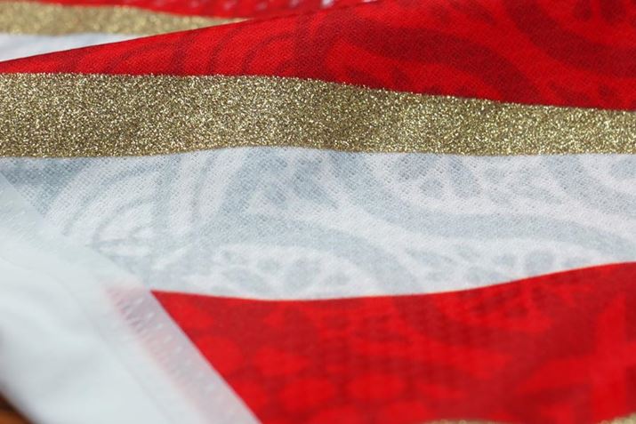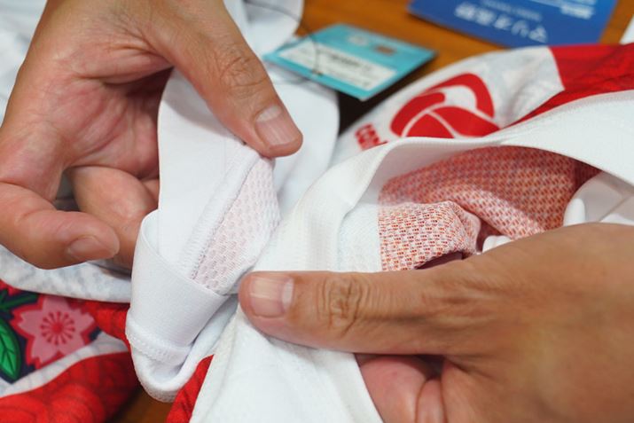 実際のジャージをよく見ると、精緻に編まれた生地が使われていることが確認できました。兜の前立てを表現した金色には特殊なラメが使われています。また、遠目にはわかりにくいのですが、生地には「和柄」があしらわれているんです!