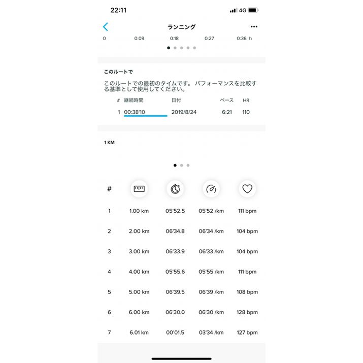 スマートフォン版の「Movescount」では、1kmごとのラップは表示できなかったが、「suuntoアプリ」(写真)では可能