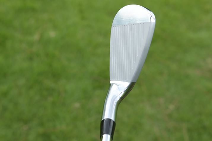 まず構えた印象は、やや小ぶりでやさしそうなアイアンといったところ。トップブレードのほどよい厚さや適度なグースネックで、「多少ミスしても助けてあげますよ〜」的な雰囲気があり、リラックスして構えられますね。かといって鈍重な感じはなく、ちょうどいい顔付きです。