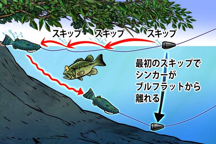 オーバーハングの入り口でスキップさせると、シンカーは止まって、ワームだけが奥に入る。そのあとラインをたるませると、沖のディープにシンカーが沈み、高い浮力のワームはシャローにとどまる。シンカーが着底してからワームをズル引きすると、ノーシンカー状態を保ちながら、底をなめるように泳ぐ