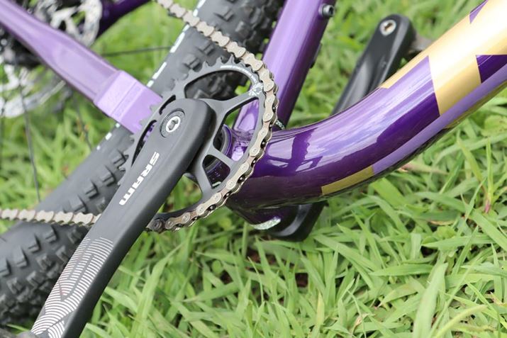 フロントのギアをシングル(1速)仕様にして、シフトチェンジのトラブルを回避。近頃のMTBに増えてきているトレンドのスタイルだ