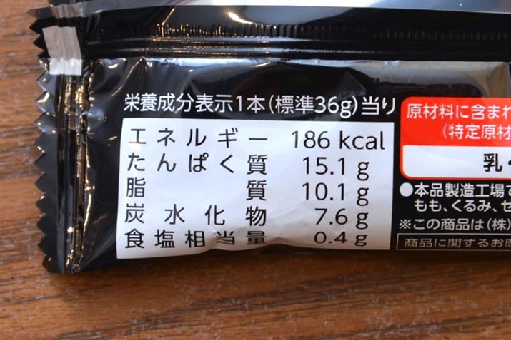 「in」シリーズからもう1商品。先ほどの「ベイクドチョコ」と比べて、糖質40%オフ、甘さをおさえた味わいで仕上げたプロテインバーです。
