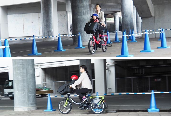 新アシストユニットを搭載した新モデルの走行性がどれほど進化したのか、従来モデルと比較して確かめてみました。乗り比べたモデルは、フロント側にチャイルドシートを装備する子乗せタイプ「PAS Kiss mini un SP」です。高ケイデンス時の違いを確認するため、どちらもギアは「1」を選択。新モデルの走行モードは自動でアシストパワーが調整される「スマートパワーモード」で走行しました。