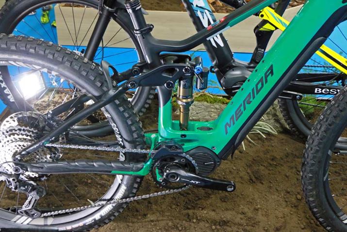 「E8080」を搭載するMERIDAブランドの「eONE.SIXTY 9000」は、カーボンフレームを採用したフルサスe-MTB。価格は85万円(税別)で、2020年1月発売予定となっている
