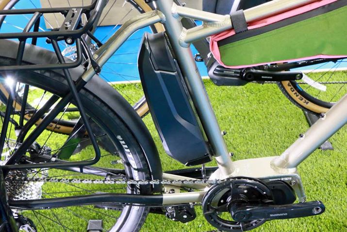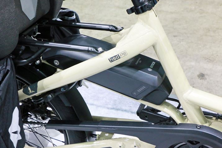 リアまわりのフレームが延長されたカーゴバイクならではの形状を利用し、車体中心に近いところにバッテリーがマウントされているのもユニーク