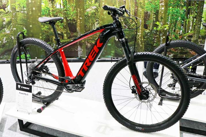 アルミ製フレームのTREK「Powerfly 5」は、フロントのみに120mmトラベルのサスペンションフォークを装備したハードテイルモデル。車重は22.2kgとなっている。価格は46万円(税別)で、2020年2月発売予定