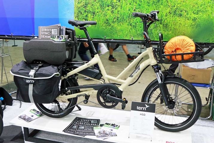 Tern「HSD P9」(28万9000円/税別)は、頑丈なフレームにキャリアを装備し、荷物を積めるようにしたカーゴバイク。前後に油圧のディスクブレーキを備えているので、荷物を積んでも制動力に不安はなさそうだ。前のラックやリアのバッグなどはオプション