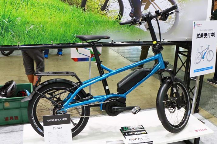 小径タイヤにリアキャリアとフロントサスペンションを装備した構造がおもしろいミニベロタイプのRIESE&MULLER「Tinker」。発売時期は未定だが、価格は46万円(税別)を予定しているとのこと