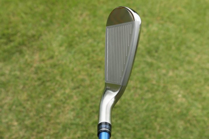イレブンアイアンを構えてみると、ゼクシオらしいやわらかなフォルムは健在。やや大きめのヘッドにグースネック、厚めのトップブレードと、安心感があふれ出る形状ですね。ヘッドタイプは、最近のやさしいアイアンの主流であるポケットキャビティ。フェース裏下部はギリギリまで掘られており、いかにもミスヒットに強そうです。