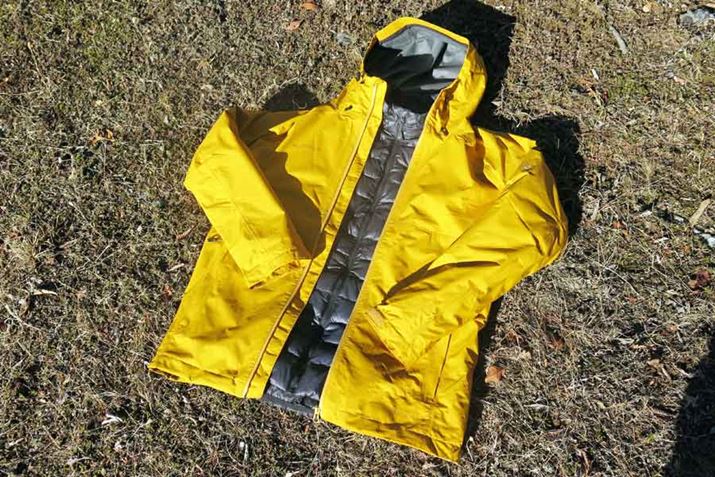 外側(イエロー)が防水透湿性素材のゴアテックスを使ったアウターで、内側(ネイビー)がダウンの中綿が入ったインサレーション。つまり、ミッドレイヤーだ