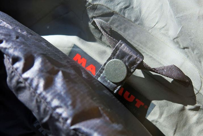 アウターとミッドレイヤーはどちらもジャケットの形をしており、首裏と両手首に付けられた3つのスナップボタンで連結し、2枚一緒に脱ぎ着できる。今回は、テストも兼ねて山中で不必要なほど何度も脱ぎ着してみたが、2枚重ねたままだとは思えないほどスムーズに着脱できた。もちろん1枚のほうが脱ぎ着しやすいのは確かだが、2枚同時でも袖が引きつれにくく、重ねたウェアがめくれることもない。