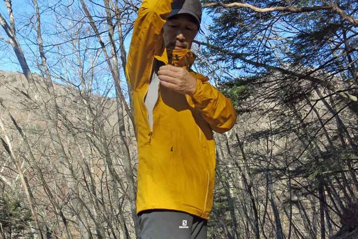 登っているうちに暑さを感じ始めた僕は、内側のダウンジャケットを外してアウターのみの状態に。ミッドレイヤーを重ねて着ることを想定したサイズのアウターだけに、単体だと少し大きめだが、着心地を損なうほどではない。生地は非常にやわらかく、ウインドジャケットとしても活用できる存在だと感じた。