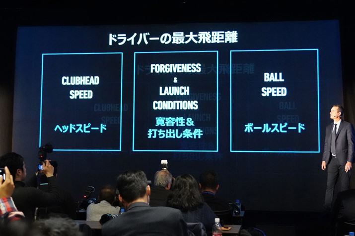 ドライバーの研究開発は、反発係数の上限がルールで決められているため、どこのメーカーも技術者にとっては二律背反との戦いになります。反発係数を一定とした場合、最大飛距離をより安定して発揮するには、いくつの条件があります。同社の説明に沿った表現を使うと、ヘッドスピード、ミスへの寛容性と打ち出し条件、そしてボールスピードが重要になります。