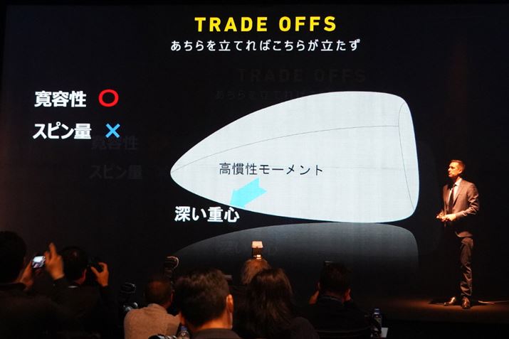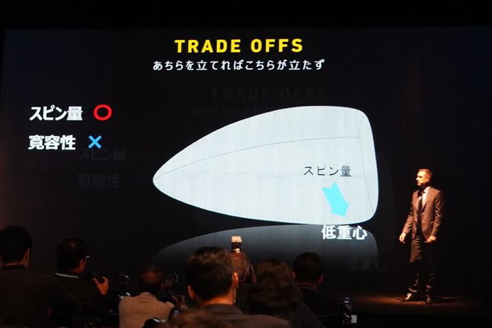 そこに同社は改めて着目し、研究を重ねて開発したのが今回のSIMシリーズなのです。発表会での説明がとてもわかりやすかったのでそのままお話しますと、スピン量を減らして強い弾道を追求すると重心が浅くなります。しかし重心が浅いと、ミスヒットしたときのヘッドのブレが大きくなりやすくなるので寛容性は下がってしまいます。反対に、寛容性を高めるべく重心を深くすると、フェース面の重心位置が高くなってしまうためスピン量が増えやすいクラブになり、飛距離性能を高めるのが難しくなります。