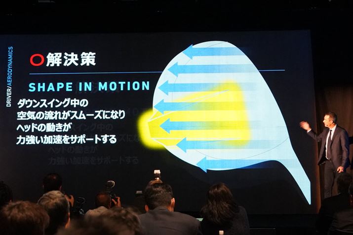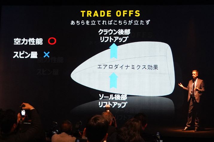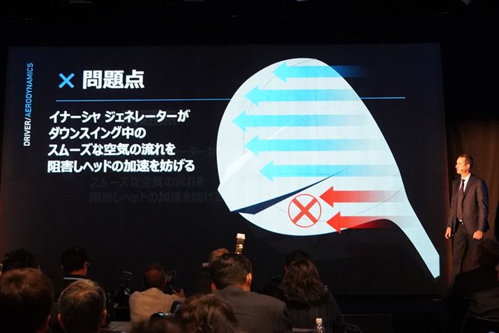 最初に説明されたのがスイング中のヘッドの動き。大切なのはトップからインパクトまでのヘッドが加速するときに、いかに空気抵抗をなくすかであるとのこと。そのトップからインパクトまでのヘッドはフェースに対して垂直に空気抵抗を受けるのではなく、ヘッド下方から、いわゆる”開いた”状態で空気抵抗を受けるので、その方向での空気の流れを考えて設計したそうです。ソールにある突起、同社では「イナーシャジェネレーター」と呼ぶ部分がやや斜めになっているのはそのためだそうです。