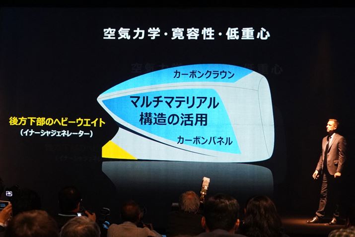 後方下部にウェイトを装着することで深重心にしつつ、カーボンを多用することで、重心が高くなりがちな空力ボディを採用してもしっかりと低重心化を実現させたのが、同社独自のマルチマテリアル構造です