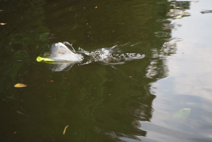 その日はにごりもなく、シャローのカバー周りでは、うろうろしているバスを見かけることも多かった。奥村さんのアドバイス通り、杭や倒木など、ボトムと水面をつなぐようなピンスポットを狙っては、「2回アクション、5秒ポーズ」を続けてみた。
