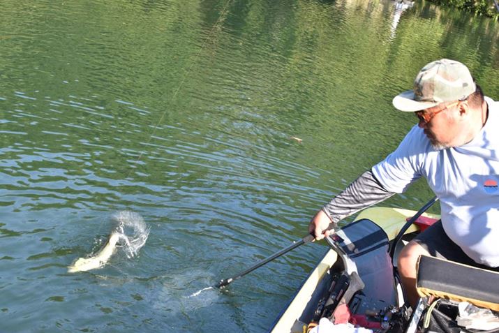 「パルスコッド」はトップウォーターのルアーなので、朝イチからボートを出した。まずは奥村さん推奨のロッド「サイドワインダー・スペックルレーサー」に「パルスコッドJr.」を結んだ
