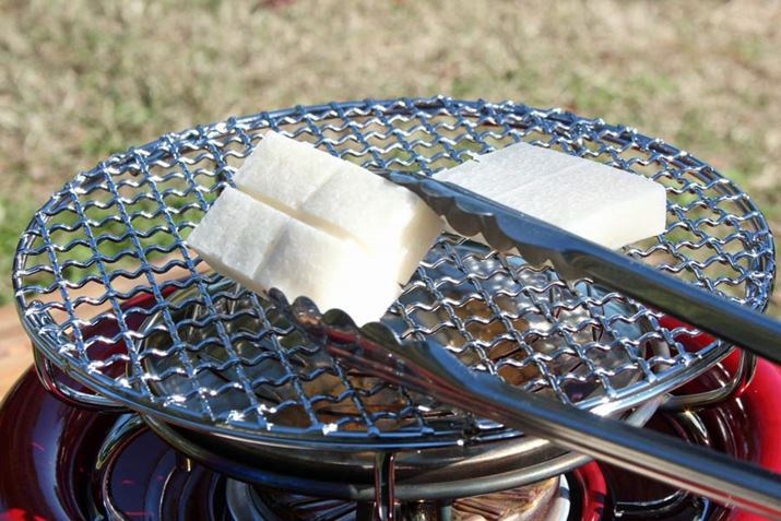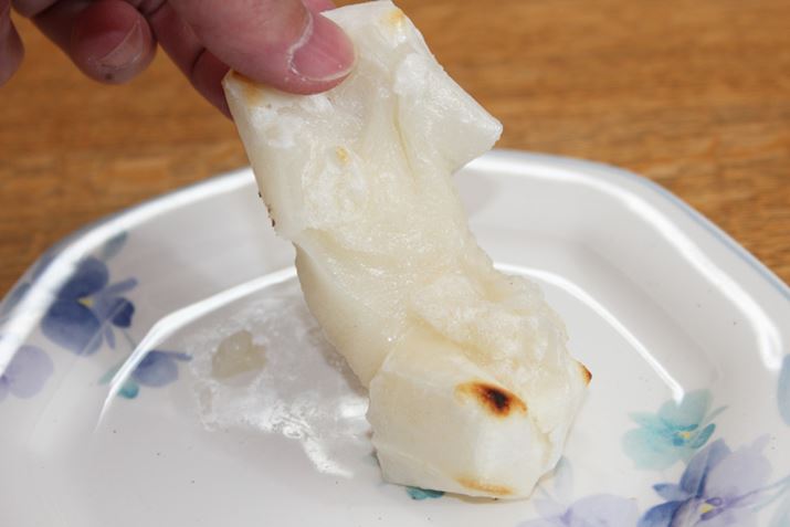 グリルキットの実力をチェックするために用意したのは、餅。直火では表面しか焼けず、中は硬いまま、外は真っ黒になりやすい食材です。