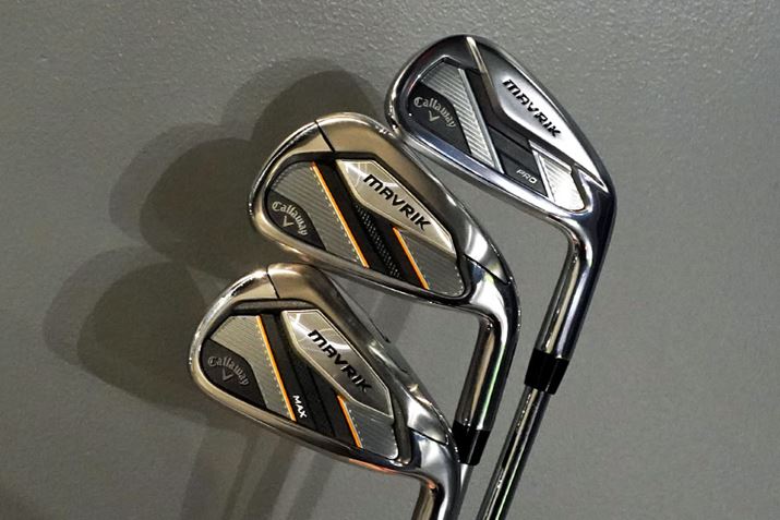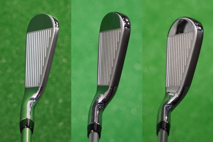 MAVRIKプロアイアン(左)。非常にきれいなアスリート向けの形状に仕上がっていますが、ロフトは7番で30.5°と割と立っている設計になっています。MAVRIKアイアン(中央)はブレードが厚く安心感抜群。ロフトは7番で27°と3モデルの中では一番立った設定。MAVRIK MAXアイアン(右)。さらにブレードが厚く、やさしそうな形状。ロフトは7番で30°(写真は8番)
