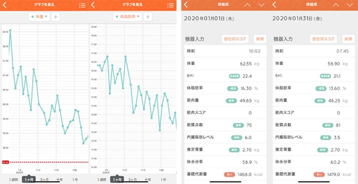 左から、1月中の体重のグラフと1月中の体脂肪率のグラフ。1月中旬にピンチがあったものの、なんとか乗り越えて体重も体脂肪もちゃんと下がっている!(タニタの体組成計「インナースキャンデュアル RD-911」で計測したデータを、専用アプリ「ヘルスプラネット」で管理)