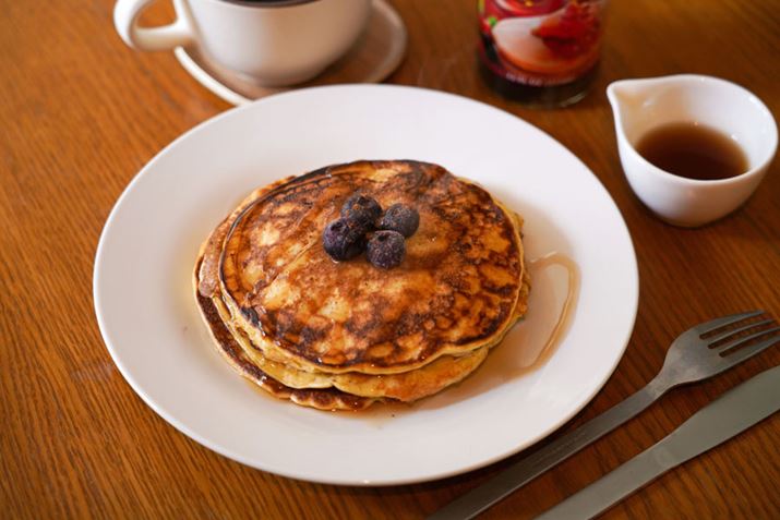 プロテインパンケーキの粉(60g)・水(120ml)・全卵(1個)で作ってみた。「普通においしいパンケーキの味がして、食事制限している気になりません!」(久米)