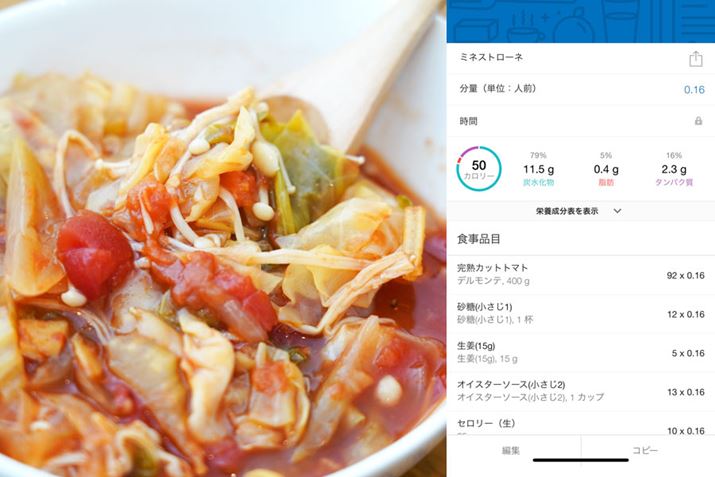 こちらが、前編<夕食1>の「トウジャン」に置き換えた「自家製ミネストローネ」。1杯あたり50kcalと超ヘルシー! 肉体改造を始めてから、どんどん料理男子としてのスキルが上がっている久米