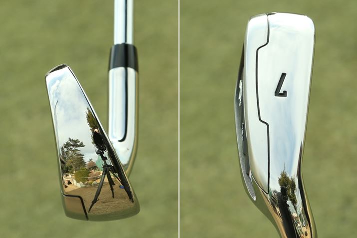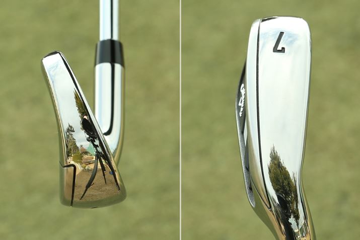 凹んだバックフェースに、ブランド名とモデル名が比較的小さく入った比較的シンプルなデザインを採用。顔は、キャロウェイ伝統のグースネック+厚めのトップブレードの組み合わせ。構えただけでキャロウェイと分かる形状です。注目のAI設計のフラッシュフェースはロング、ミドル、ショートアイアンのそれぞれに求められる性能に合わせて設計されており、上下の溶接位置をフェース面から離すことで反発エリアを広げる「360フェースカップ構造」と組み合わせて搭載。打点のミスに強く、なおかつ最適な弾道が得られやすいように設計されています