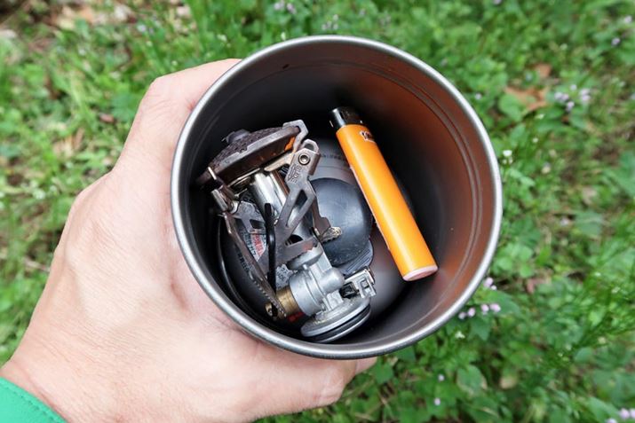 使用していない時のクッカーは、内部に無駄なスペースが生まれる。登山では、この空間に小物を収納して利用するのが鉄則だ。チタニウムボット700の場合、パッキンで密封されるので、当然ながら「ボトル」として飲料水などを入れてもよい。しかし、一般的なクッカーと同様、小物を入れるのにもちょうどよいサイズである。
