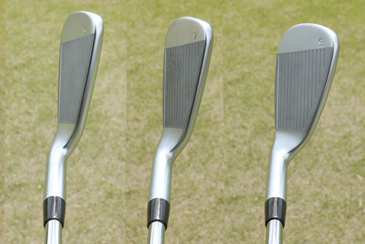 左から#5、#7、#9。ミート率が低くなりやすい長い番手はやや面長で大きめなサイズにし、短くなるにつれ、ヘッドサイズを小さくすることでヌケを考慮し、シビアなショットにも対応できるように設計されています。オフセット具合も、ボールをつかまえやすい短い番手ほど少ない、方向性を考えての仕様になっていますね