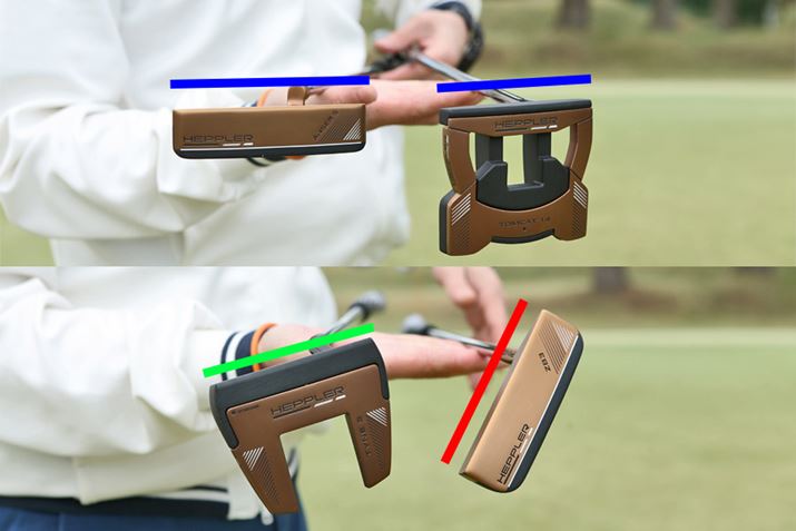 この3分類、具体的に何が違うのかというと、シャフトを支えてヘッドを宙に浮かしたときにフェースが作る角度、いわゆる重心角です。トゥ側が下に垂れ、フェースが大きく横を向くモデルが「アークタイプ」、フェースが真上もしくはほぼ真上を向くモデルが「ストレートタイプ」、その中間が「セミアーク」です。
