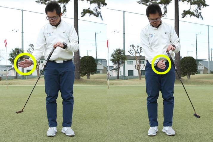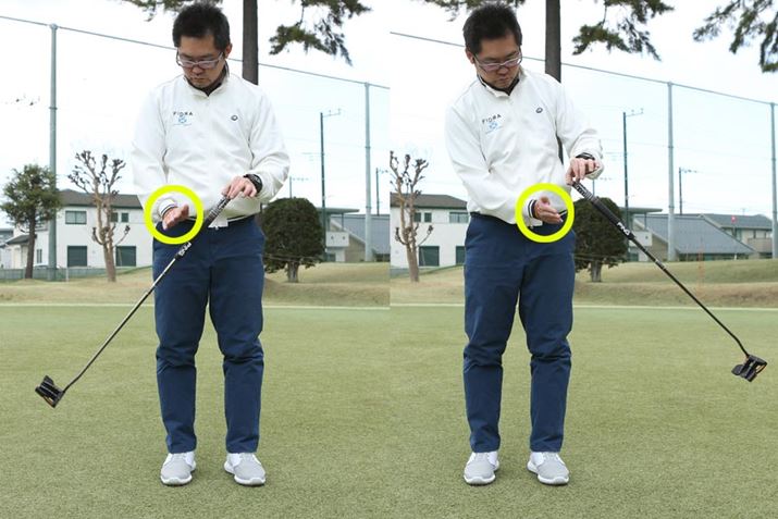 写真の右手はフェースの向きを表しています。弧を描く軌道はテークバックでフェースが開き、閉じながら打ち出す動きになりやすく、これには重心角の小さいパターがマッチします