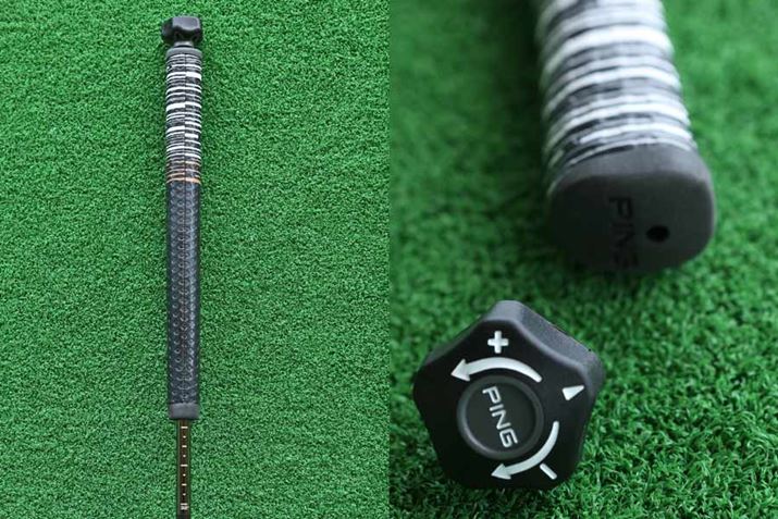 ピン独自の機構である、長さ調整機能付きシャフトもラインアップ。シャフトに目盛りが付いています(左)。グリップエンドにレンチを差し込んで回すだけで、パターの長さをかんたんに調整することができます(右)