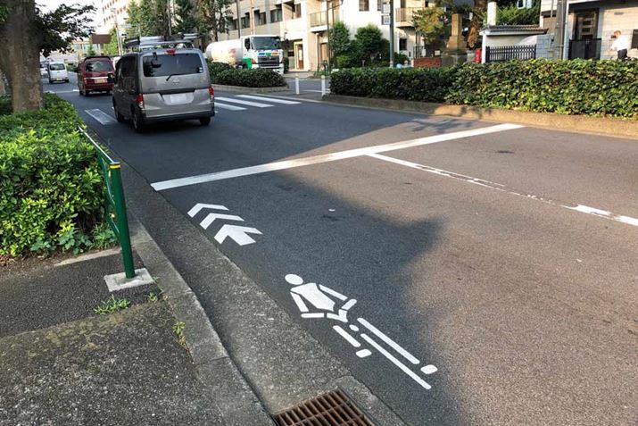 横断歩道の併設されている自転車のマークがある部分が自動車横断帯。しかし、自転車横断帯があることで起こる事故を低減すれるため、この数年撤去が進んでいる