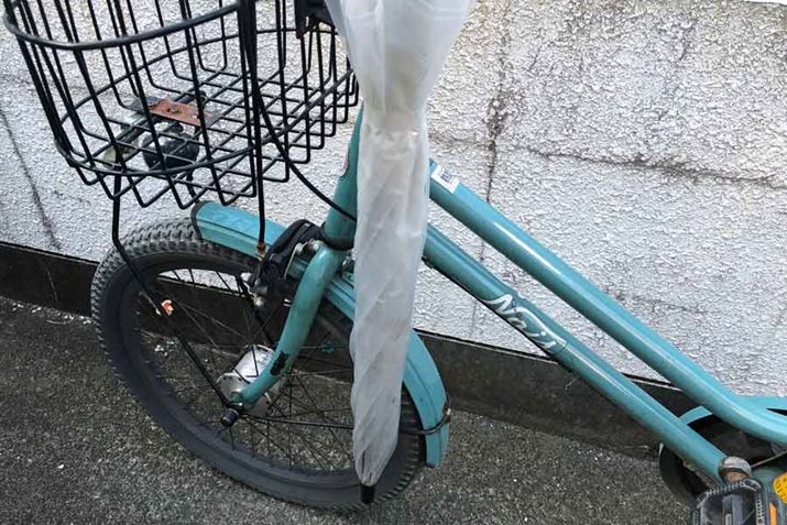 ハンドルに傘を引っかけて走行すると傘が車輪に巻き込まれて転倒する可能性もあるので、違反行為ではないが止めよう