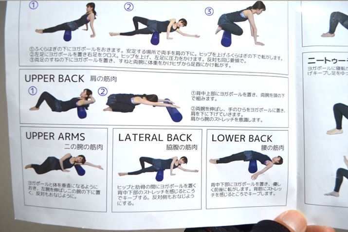 使い方もいたってシンプル。ヨガポールの上に身体を載せ、転がすように身体の各部に押し当てながら身体の角部を伸ばしていく動作をいくつか行います。