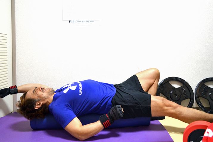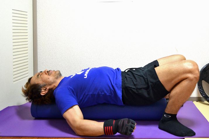 背中全体にローラーを転がすようにして加圧。ヨガポールを縦にして身体を載せるときとはまったく異なる刺激が背中と腰に加えられます。デッドリフトと呼ばれる下半身と背中、腰のウェイトトレーニングで身体の後ろ半身が凝り固まったときに行うと、腰や背中の疲労感がすごく楽になります