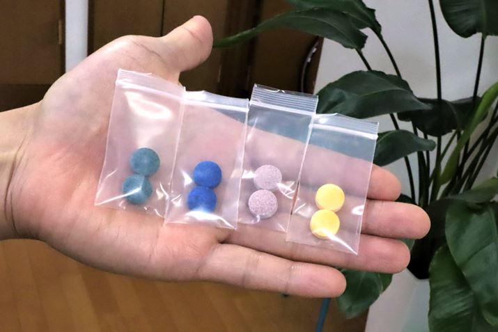 バッグ内の水に、色が付けられるタブレットが付属しているのがおもしろいです。パープル、ブルー、ピンク、イエローの中から選択可能