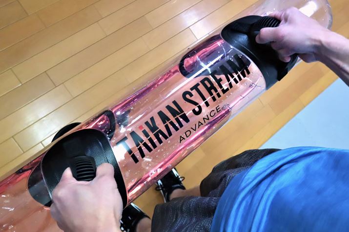 運動のジャンルとしては、「ウォーターバッグトレーニング」と言われるもので、水が入ったバッグを持ち上げるエクササイズが行えます。バッグ内の水が動いて不安定なった状態を安定させようとすると、ユーザーの体幹に刺激が入る仕組みです。ちなみに、自他ともに認めるトレーニングマニアとしても知られる、サッカー日本代表の長友佑都選手も愛用しているギアだそう。