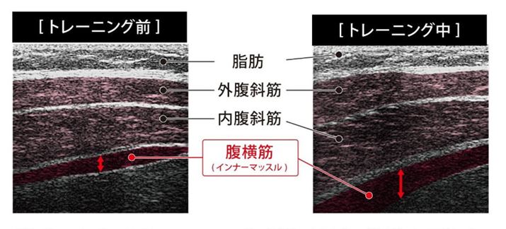 「タイカンストリーム」を使用すると、腹横筋(インナーマッスル)が活動することがわかります。表面だけではなく、深部の筋肉にまで効果を発揮!