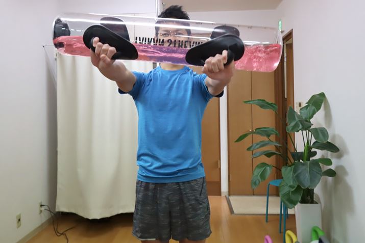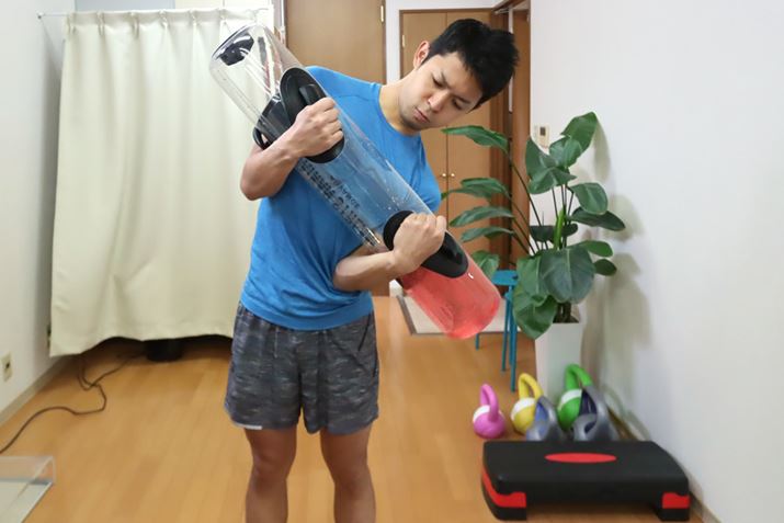 「持ち上げる→10秒静止→下ろす→10秒静止」を3分間繰り返します。簡単な種目だとあなどっていましたが、バランスを取りながらバッグ内の水が動かないようにするのがなかなか難しい。難しいと同時に、かなり身体に効いてきます。