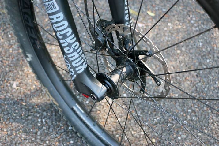 フロントサスペンションの幅が広い理由は、フロントホイールのハブにブースト規格と呼ばれる110mm幅の剛性が高いタイプを採用しているため。近年の下リ系マウンテンバイクではスタンダードになりつつある規格だ