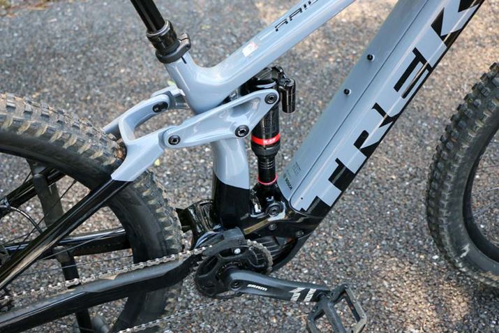 車体中央に縦に配置されたリアサスペンションは、リンクを介して150mmのトラベル量を確保。リンクにはトレックの特許技術「アクティブ ブレーキング ピボット(ABP)」が採用されており、ブレーキング中もタイヤを路面に押し付け続ける効果を発揮する