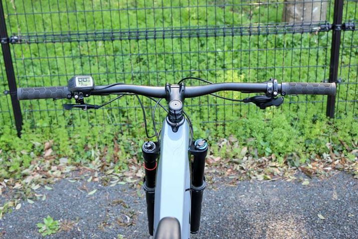 ドロッパーポストの操作レバーはハンドル左手側にある。同じく左手側にはアシストのモードを切り替えるコントローラー、右手側には変速レバーを装備。なお、ハンドルは780mmと幅広なので、下りで押さえがしっかり効く