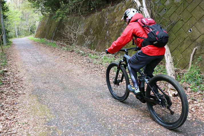 トレイル入り口までの道は、標準的な「TOUR」モードで走行。普通のマウンテンバイクなら途中で息が上がるほどの斜度の坂道が続いたが、e-MTBなので会話しながら余裕で走行できた