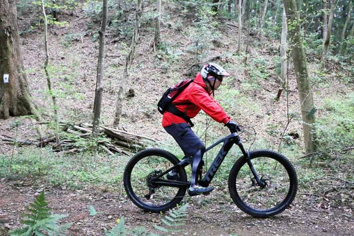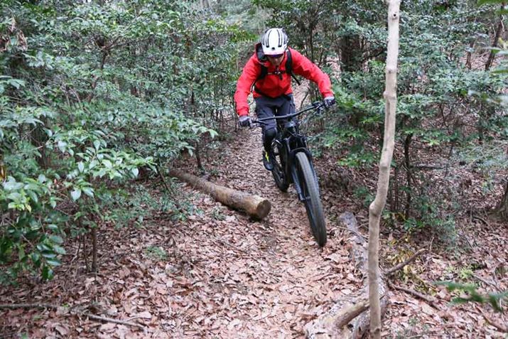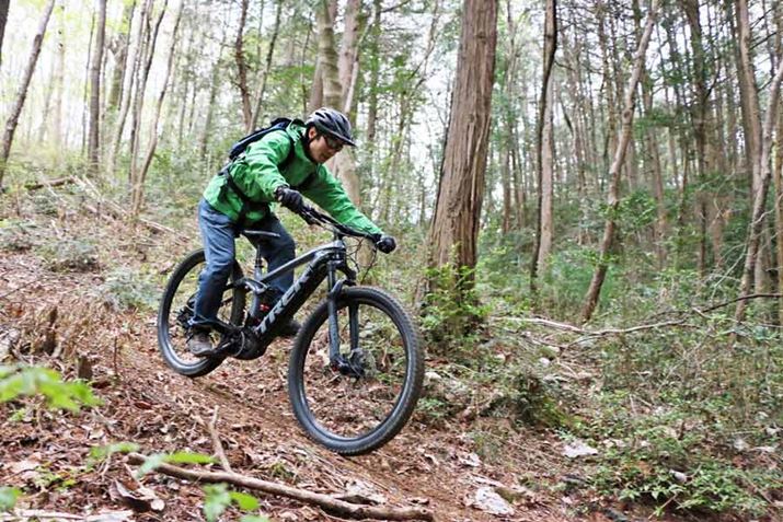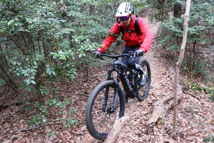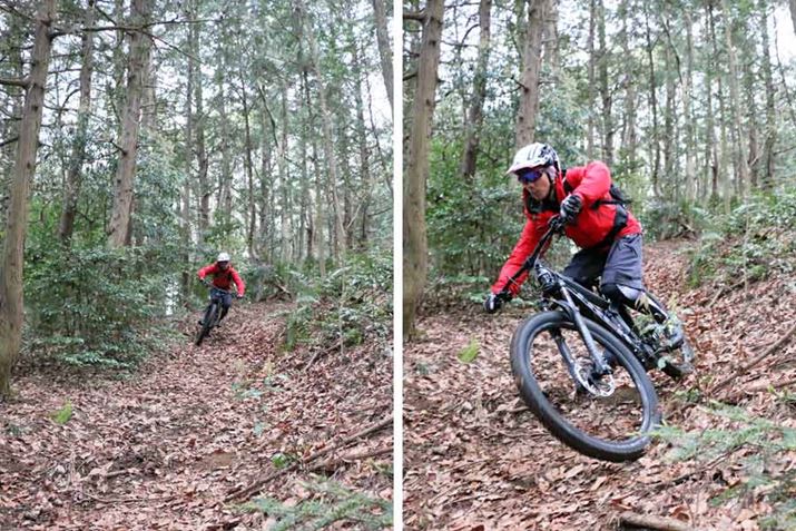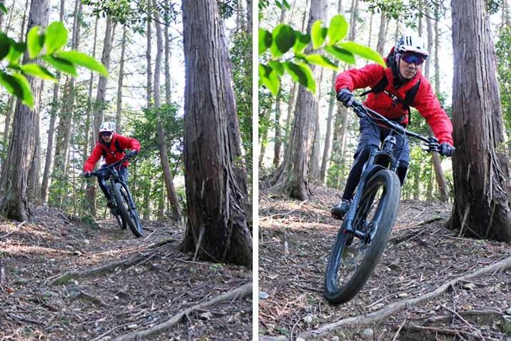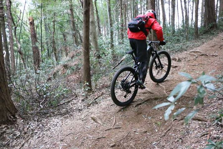 それなりに斜度があり、かつ、路面には木の根が露出しているシーンでもタイヤが暴れず、スムーズに登れる。この特性は山道を走るのに慣れていない初心者にもありがたいはずだ