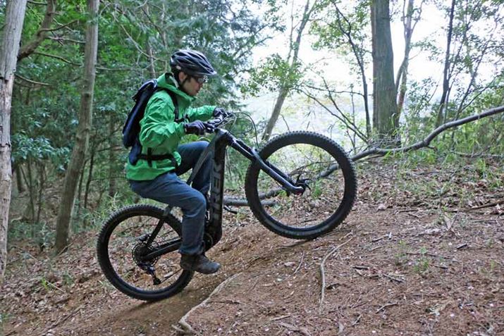 わずかなギャップを利用し、フワッと浮くようなジャンプ! バッテリーやアシストユニットを積んでいるとは思えない軽やかさは、カーボン製のフレームとホイールの恩恵だ