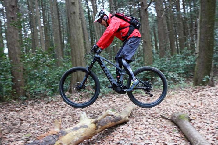 登りの性能が高いことは十分感じられたが、登りであれば、多少重いアルミフレームのe-MTBでもフルサスならRail 9.7と同等レベルの性能を発揮することはできるだろう。カーボンフレームにカーボンホイールを装備したRail 9.7だからこそのアドバンテージは、まだ体験できていない。そう思いながら進んでいくと、山道をふせぐように倒れた丸太が現れた。それを見て佐藤さんが「飛べるかも」とつぶやき、丸太へと突進!