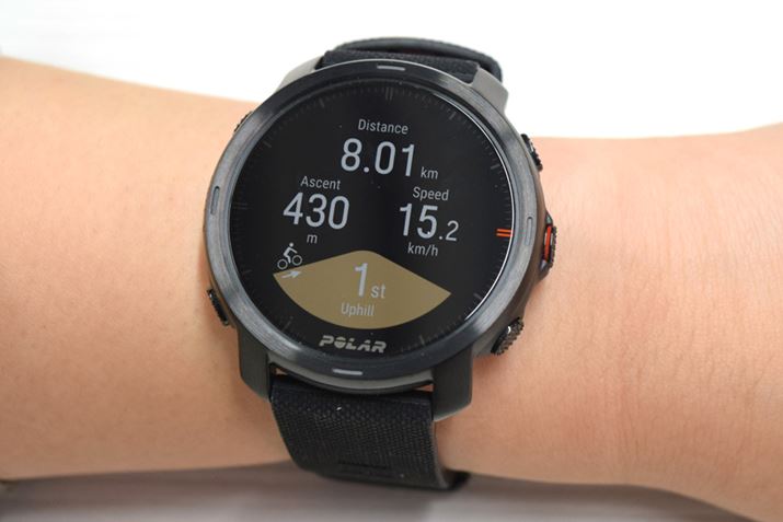 本体のディスプレイでも、セクションごとの計測データを表示。写真は、自転車で走った際の記録の一部。1回目のアップヒル区間を、平均時速15.2kmで8.01km走行したということがわかる