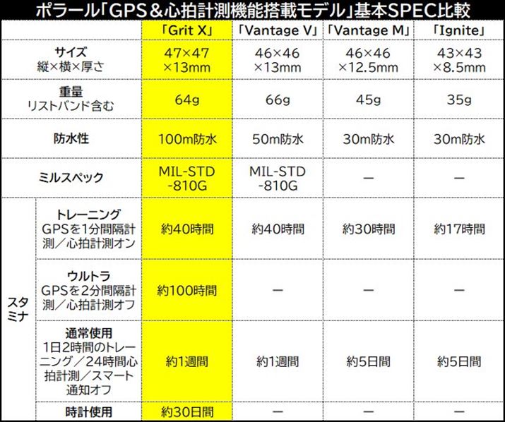 最後に、従来のGPS&心拍計測機能モデルと「ポラール グリット X」の基本スペックを比較してみた。